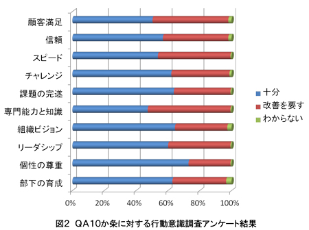 「QAスキル向上WG」では、品質保証技術者に求められる望ましい行動規範を「QA10か条」にまとめ、毎年、この10か条に照らした技術者自身の行動についてのアンケート調査を実施しています。図2は2011年度のアンケート結果です。